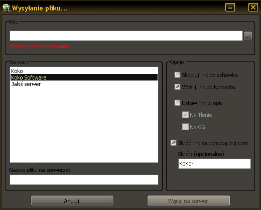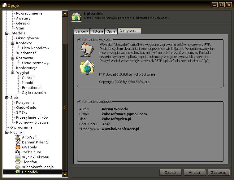 Mam przyjemność zaprezentować wam pierwszą publiczną wersję nowej wtyczki Uploadek. Jest to wersja testowa, posiadająca masę błędów, które będę się starał jak najszybciej usuwać. Wtyczka umożliwia szybkie i wygodne wgrywanie plików na dowolne serwery FTP z poziomu komunikatora. Wtyczka automatycznie tworzy link do pliku, posiada możliwość jego skrócenia za pomocą serwisu tnij.com. Wygenerowany odnośnik możemy skopiować do schowka, ustawić w stan opisowy i nawet wysłać do wybranych kontaktów. Download